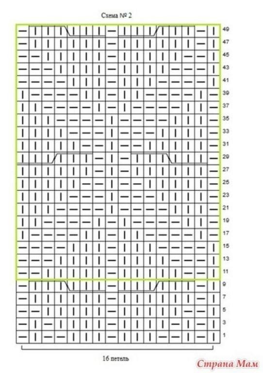 Перейти к схеме №2. Раппорт узора в ширину 16 петель, повторяется 9 раз.
