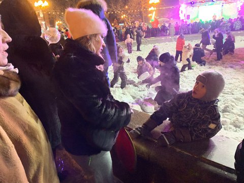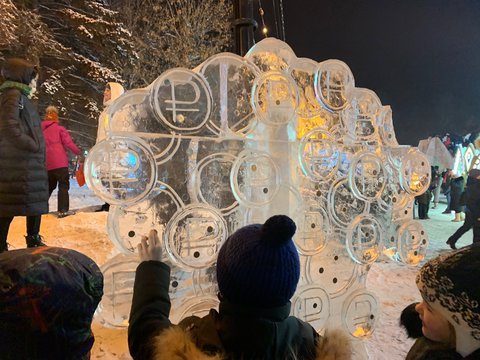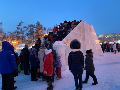 Взрослые и дети любуются ледовыми скульптурами, установленными в сквере. ![]() |