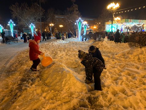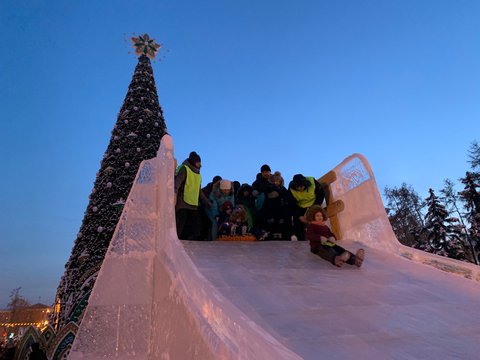 Установка елки началась в середине ноября. В декабре в сквер завезли лед для монтажа горок, детского лабиринта и ледяных фигур.