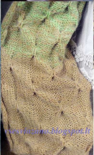 Наберите 183 петли и в 4 нити кофейного цвета вяжите по высоте 6 ромбов ( один рядом с другим в шахматном порядке выпуклым ромбовидным узором; далее вяжите 2 ромба тремя кофейными и одной салатовой нитью, 2 ромба в две кофейные и две салатовые нити, еще 2 ромба в одну кофейную и три салатовые нити, и далее до самого верха вяжите в четыре салатовых нити (6 ромбов).Закрывать подмышки по модели не надо, но далее все части от линии подмышек вяжите отдельно.