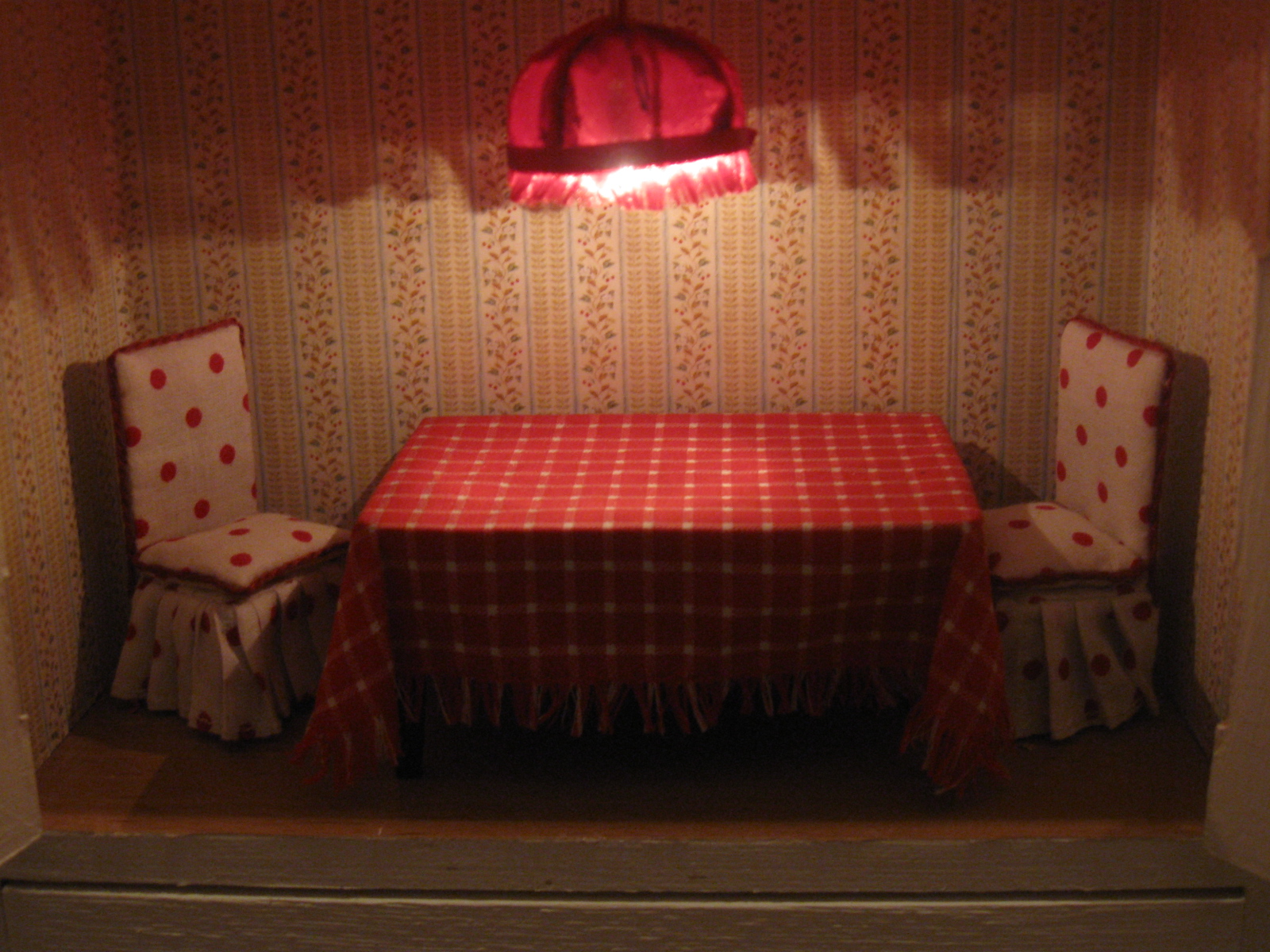 [320x240]Подвешиваем абажур в нашем миниатюрном домике над столом, регулируя расстояние над столом. В следующий раз напишу об электричестве в домике.