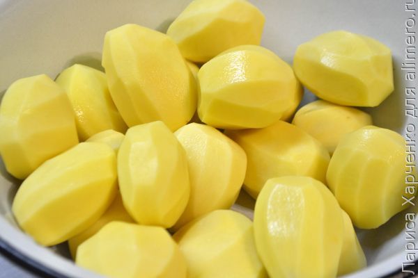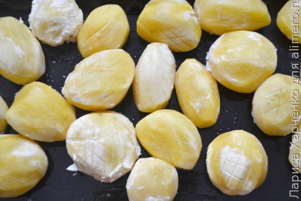 Сколько времени нам для этого понадобится: подготовительных 3-4 часа, для запекания – минут 40-50 Алгоритм приготовления этого вкуснейшего и необычного гарнира: Первый вид термообработки: Предпочтение следует отдавать клубням небольшого (лучше меньше среднего), а главное – одинакового размера! От этого зависит и внешний вид готового картофеля, и равномерность, а также скорость его приготовления. Выбранный картофель моем и чистим. ![]() Далее картофель заливаем водой и ставим на огонь. Добавляем щепотку соли и куркуму – она нам понадобится для цвета готового картофеля, чтобы он был порумяней и позолотистей. ![]() После закипания воды мы засекаем 9 минут и готовим картофель на тихом огне указанное время. ![]() После воду сливаем, а сам картофель остужаем. В качестве декора как раз на этом этапе мы можем немного оформить каждый клубень, сделав надрезы кухонным ножом на каждой из сторон. Второй вид термообработки: Теперь выкладываем отваренные и остуженные клубни на широкое и плоское блюдо, а после отправляем в морозилку до полного замерзания – на это может уйти 3 и более часов. А можно даже на ночь. Третий вид термообработки: Осталось лишь выложить мёрзлый картофель на смазанный любым растительным маслом противень и быстро отправить в разогретую до 200 градусов печь. Не забываем через время перевернуть на другую сторону. ![]() Возможно, вы спросите, зачем такие сложности? Именно благодаря таким хитрым манипуляциям готовые запеченные клубни получаются с удивительной хрустящей корочкой и удивительно мягкие и нежные внутри, подобно картофельному пюре. Полезный комментарий: Давно готовим такой картофель. Обалденно вкусным получается молодой картофель в кожуре-плёночке. Ну, а на зимние праздники с осени у нас отсортирован и заготовлен мелкий картофель. Помыли, почистили, заложили в кастрюлю, слегка присолили, немного поварили (не более трёх минут, пять - уже начинает отслаиваться, рассыпаться, получается неприглядный вид), остудили, поцарапали вилкой, как бы сделали продольные надрезы. Это для эстетики, на вкус не влияет. Упаковываем в пакеты и в морозилку до особого случая. Когда такой случай появился, достаем из морозилки, замороженный картофель сдабриваем специями, перцами и заправляем соевым соусом слабосоленым, т.к. мы уже слегка присаливали во время варки. Форму для запекания смазываем маслом, укладываем наш картофель и ставим в разогретую до 200 градусов духовку. Готовим 45-50 минут и наслаждаемся аппетитно зажаренным, а внутри, как масленичное пюре. |