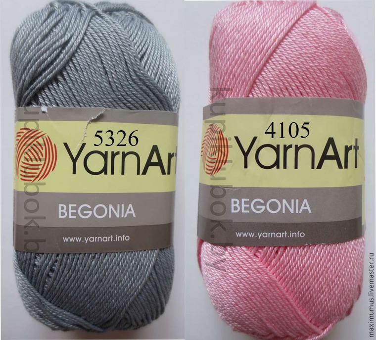 1. Пряжа Бегония от Ярн Арт 169м/ 50 гр. Расход около 160 гр (меньше 50 гр для вязания кокетки, около 110 гр для вязания юбки и роз для декора). Розовыц цвет пряжи -это номер 4105, серый цвет- 5326.