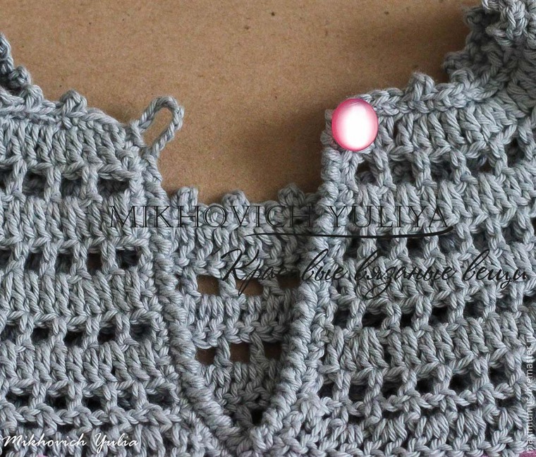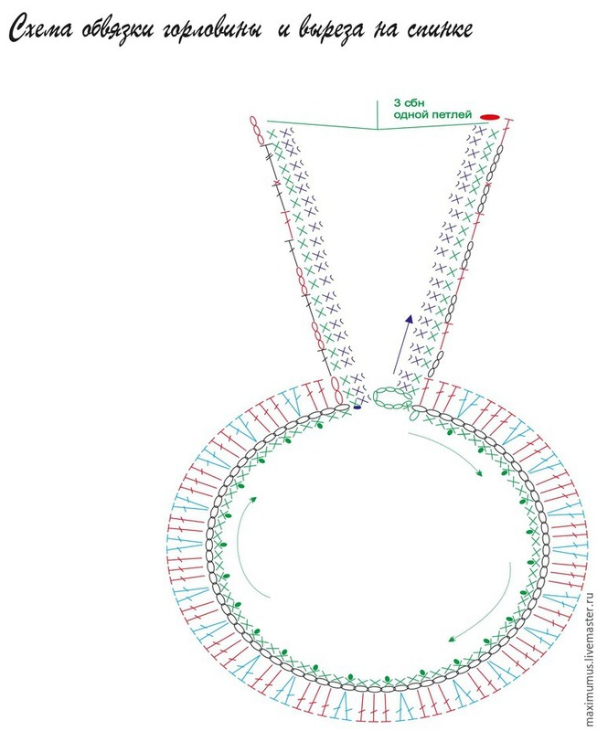 1 ряд. по горловине это сбн и сбн с пико (см. схему обвязки). По спинке-сбн. В последнюю петлю на спинку связать 9 вп и прикрепить в тоже место (петля для пуговицы).