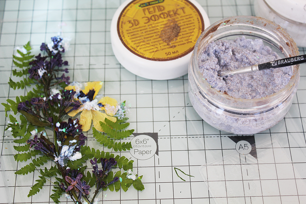 * Если вы не хотите, чтобы потерялся цвет у гербария, добавляя какие-то гели и пасты сушите их так, чтобы высыхало у вас все в открытом виде.
