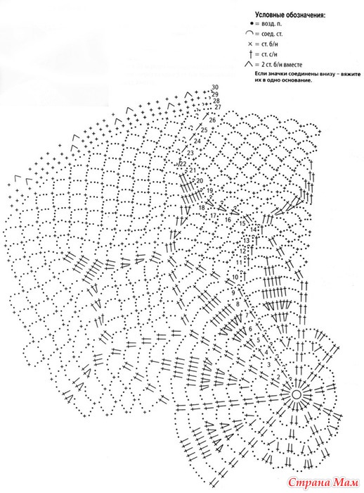 Обратите внимание, что в 29-м и 30-м рядах необходимо сделать убавления - через каждые 5 ст. б/н провязывайте два ст. вместе.