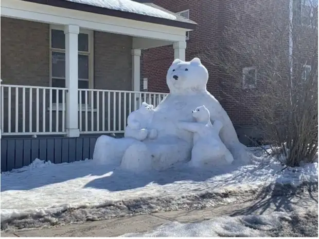 Вместо рук у нее две 9-метровые канадские ели, вместо ресниц — 16 лыж, а вместо губ — крашенные в красный цвет шины. Растаяла красавица лишь в июле.