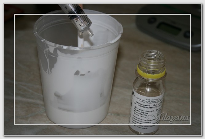 Теперь отмеряем при помощи шприца катализатор. Необходимое количество катализатора можете посмотреть в инструкции к компаунду.