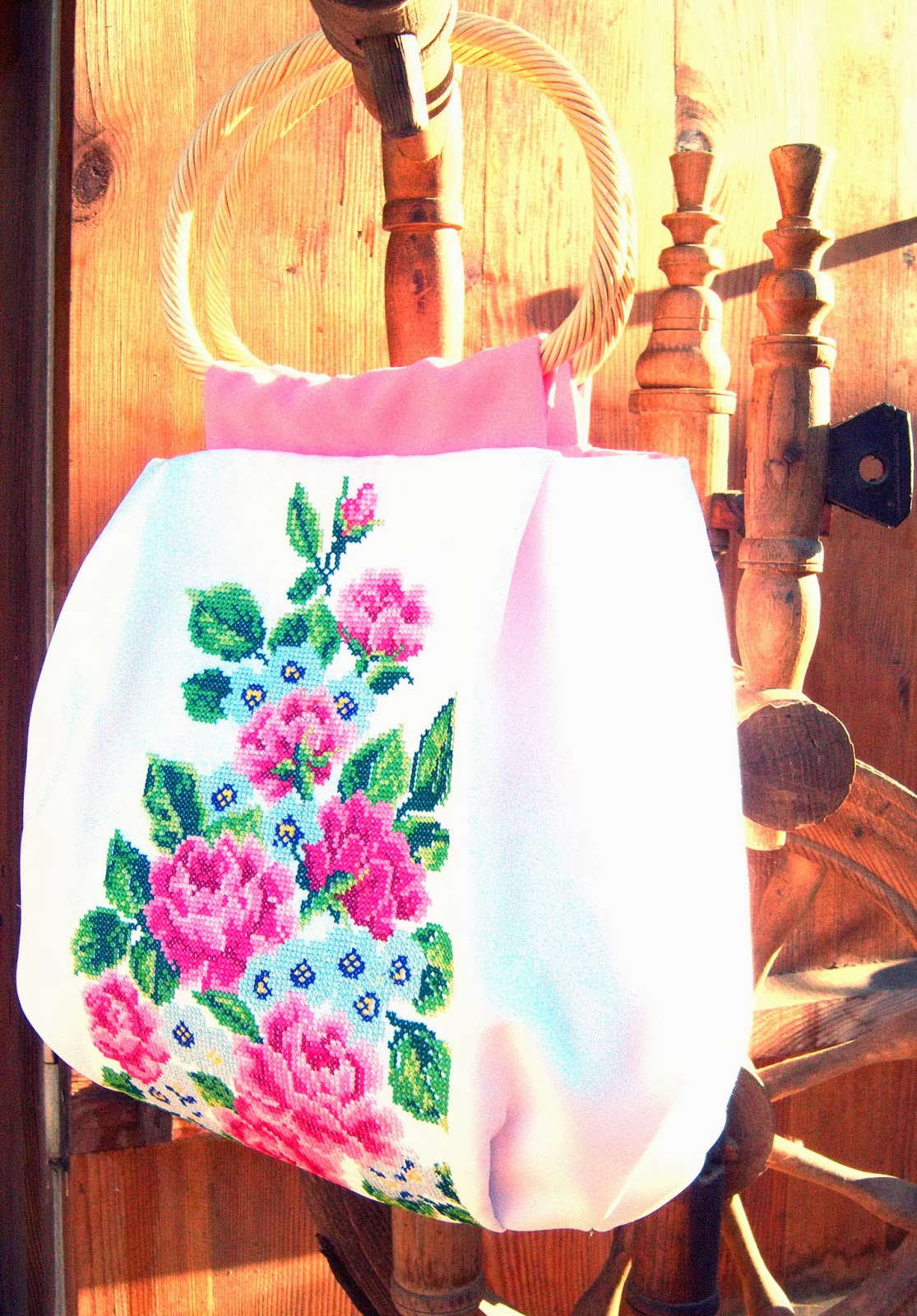 Форма сумочки якось склалася сама собою. Вишивка досить габаритна, тому хотілося чогось відповідного. Матеріал - габардин білого та рожевого кольорів. Підкладка - бавовна в горошок.