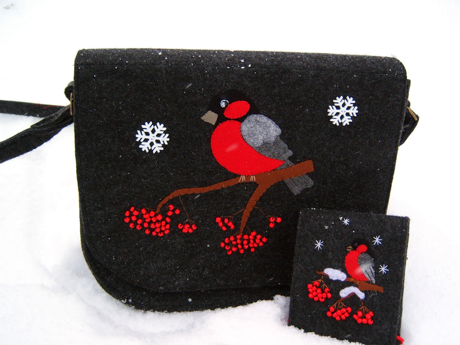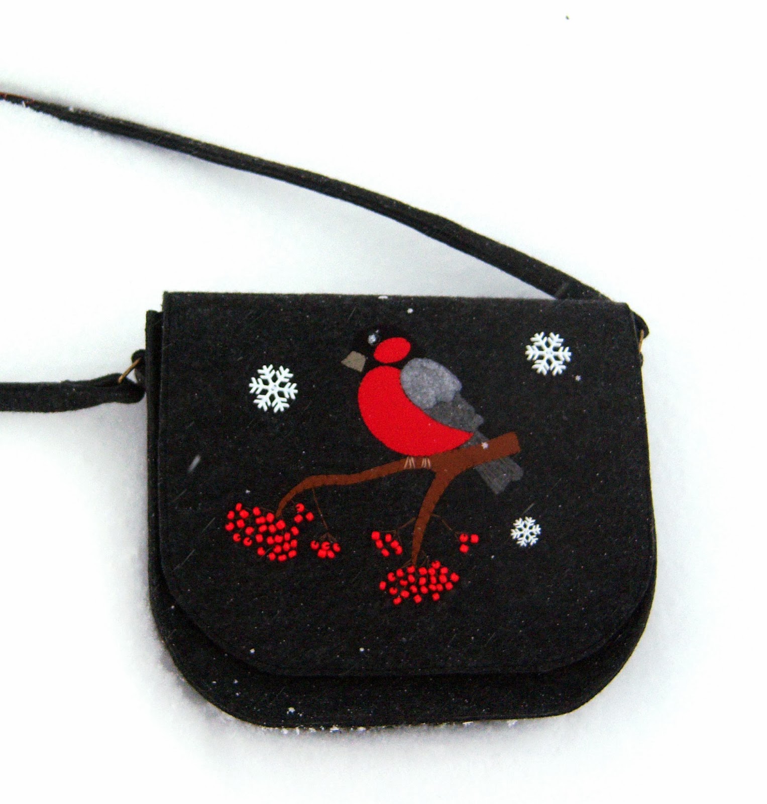 клапан продублювала вітчизняним войлоком (з якого шила першу сумочку). Застібка - магнітна кнопка. Підкладка з новорічної бавовни з сніжинками та одна потайна кишеня на замку.