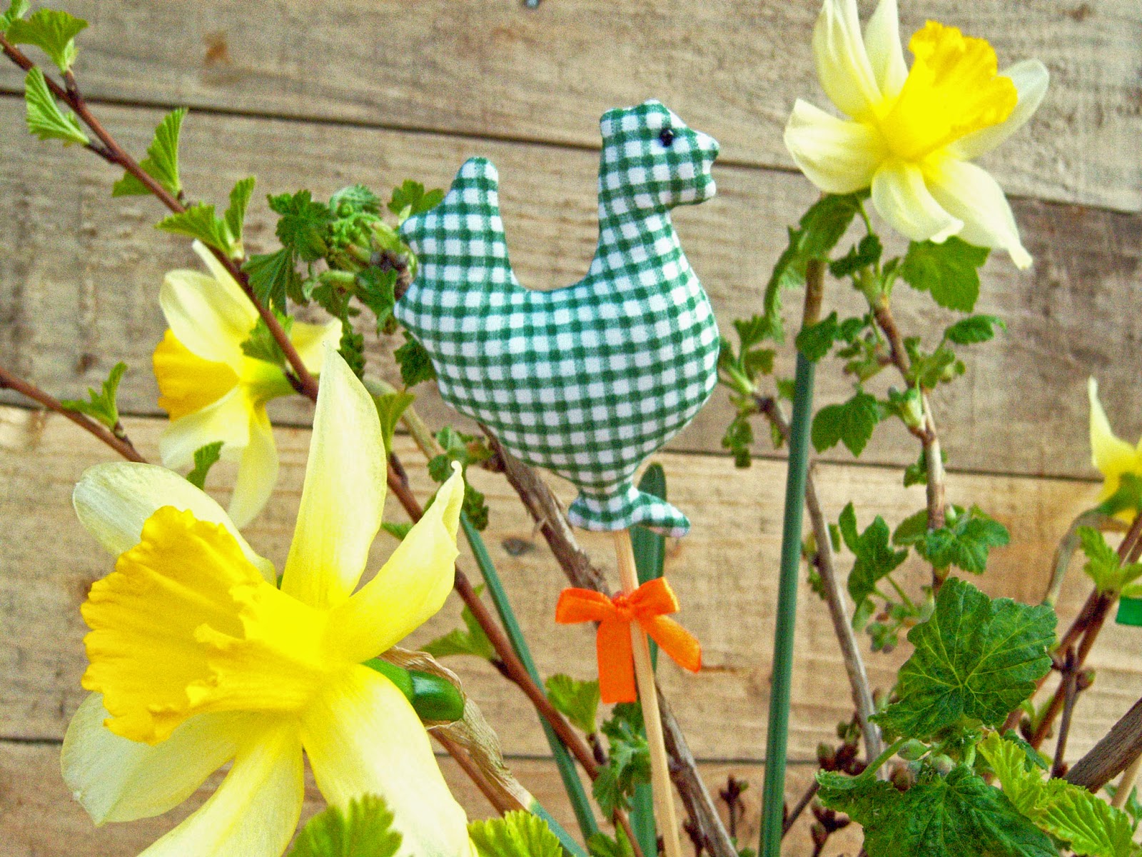 А потім - кілька гілочок смородини, ще якісь напіврозпущені гіллячки невідомого корча :-), букетик подарованих жовтих нарцисів - і декор готовий :-) І курочки, звичайно :-) Хто їх ще цієї весни не шив? признавайтесь :-)