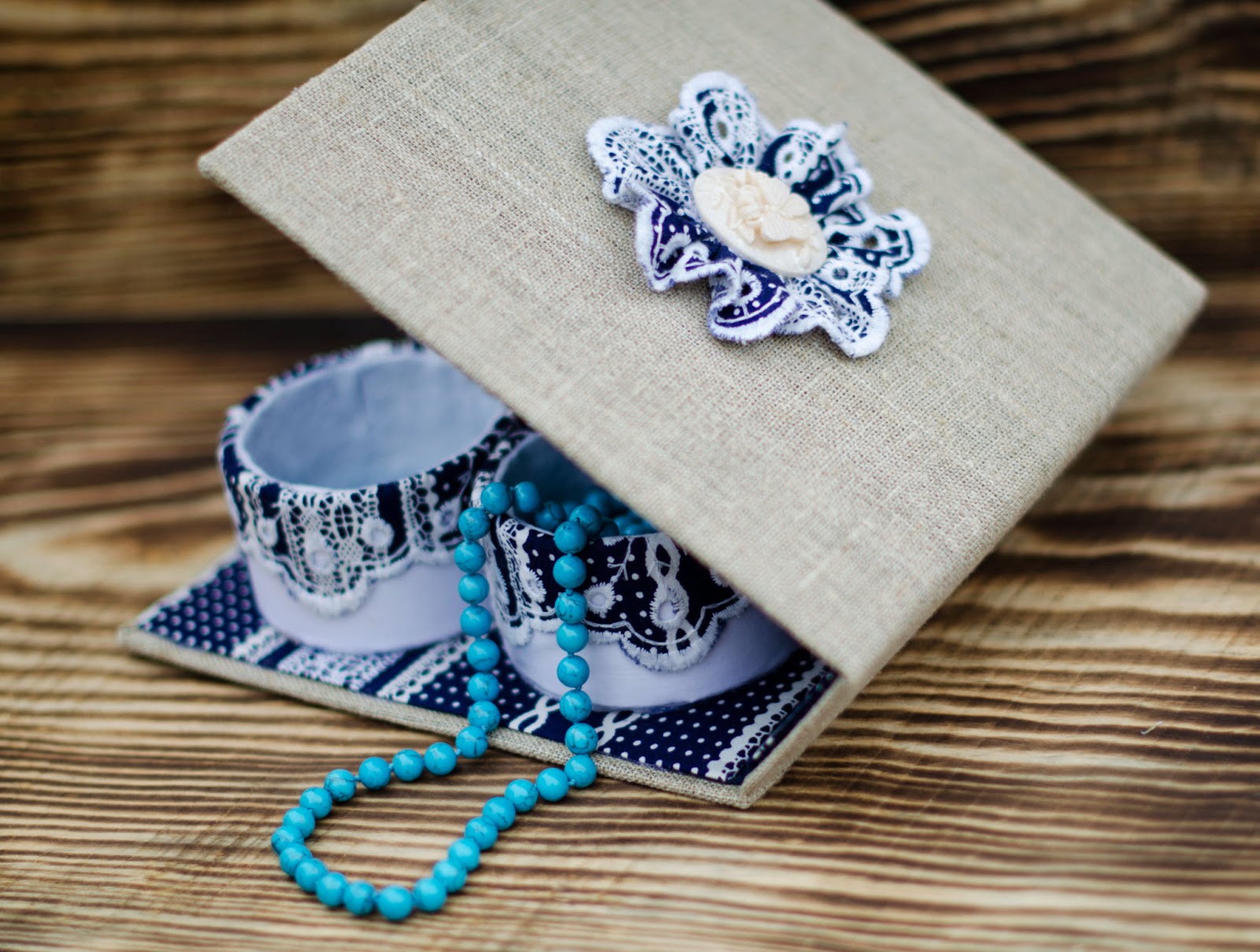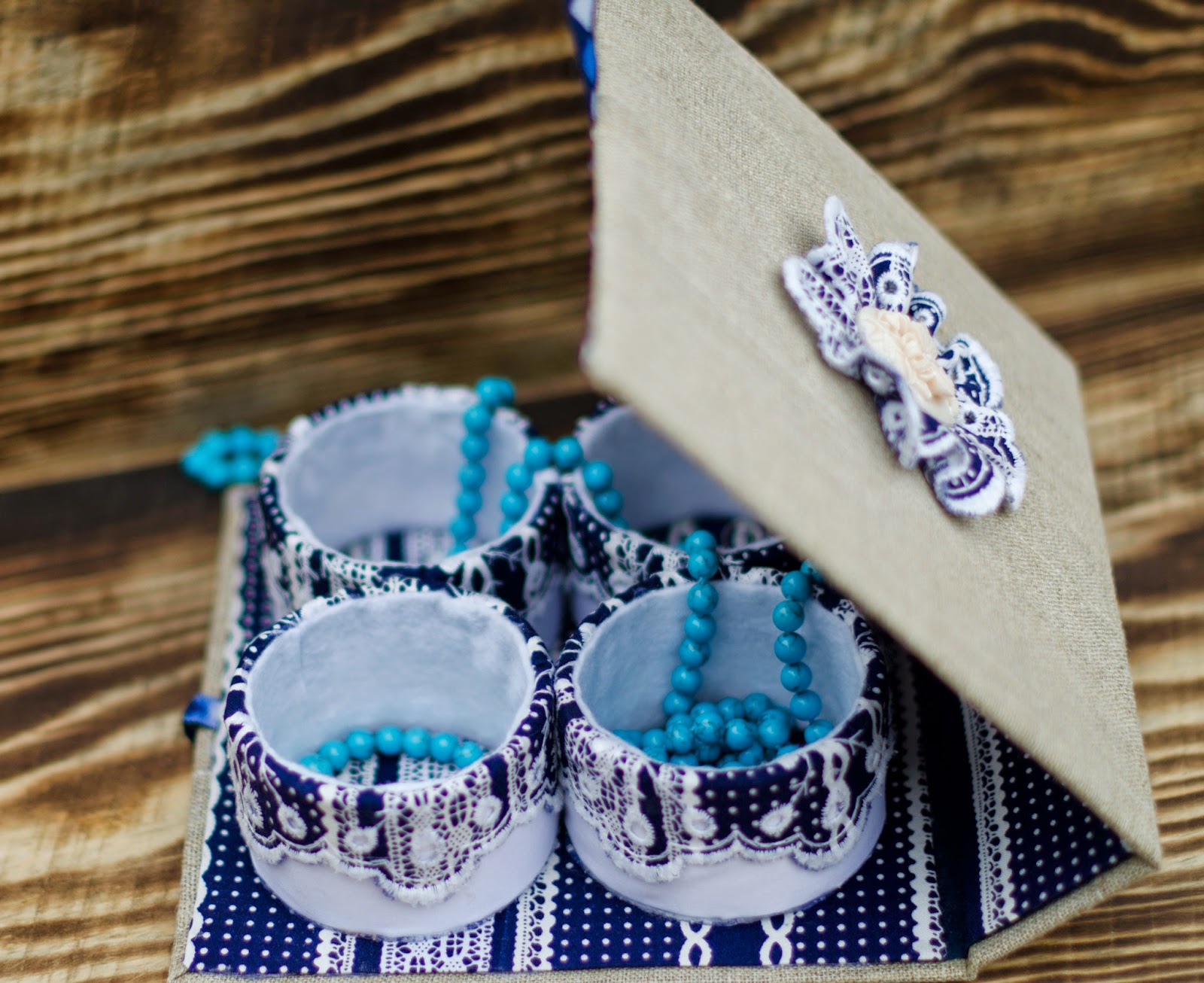Шкатулка прекрасно підійде для зберігання дрібних рукодільних запасів - гудзичків, підвісок, бусин, і т.д. Хоча під час фотосесії в ній прекрасно розмістився мій новий бірюзовий комплект прикрас :-))))