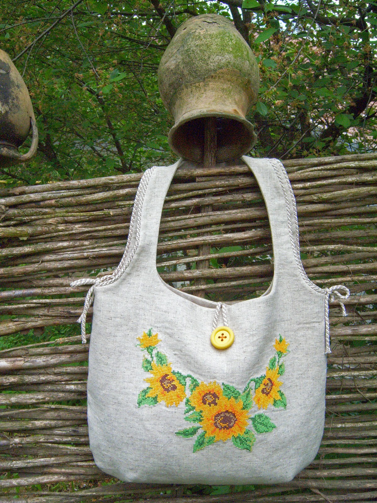 Проте, цього разу, тут є власна "ізюминка" - лляний шнур, пришитий по контуру ручок, який зав'язується по боках сумочки (до слова, зав'язувати його можна на свій смак :-))