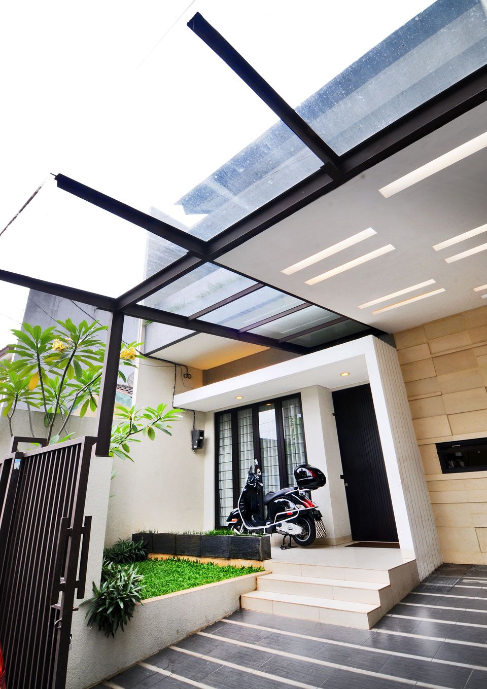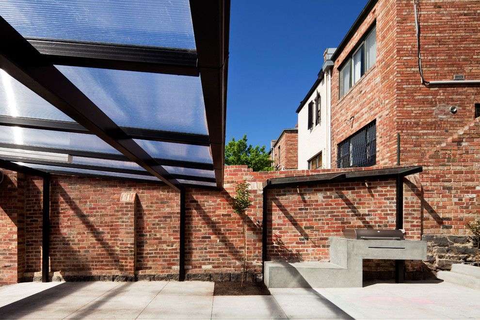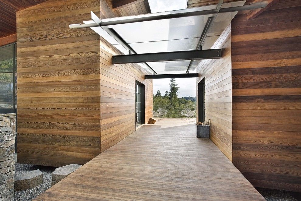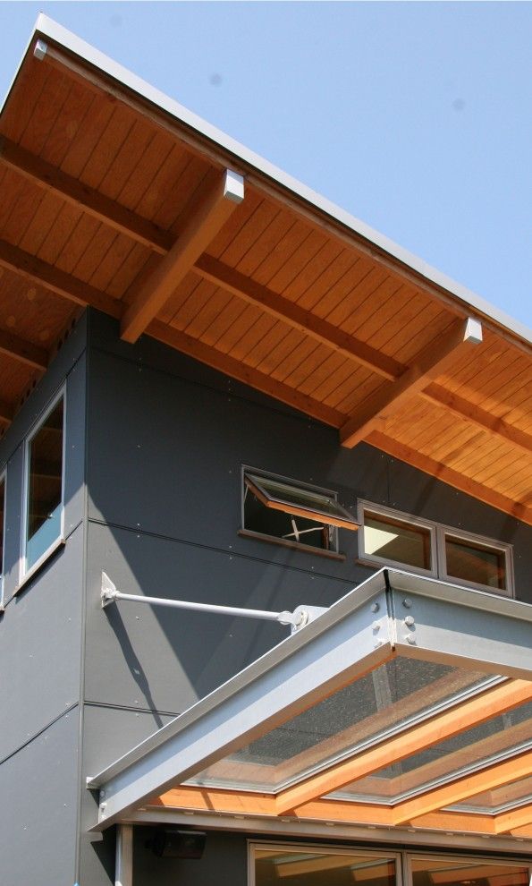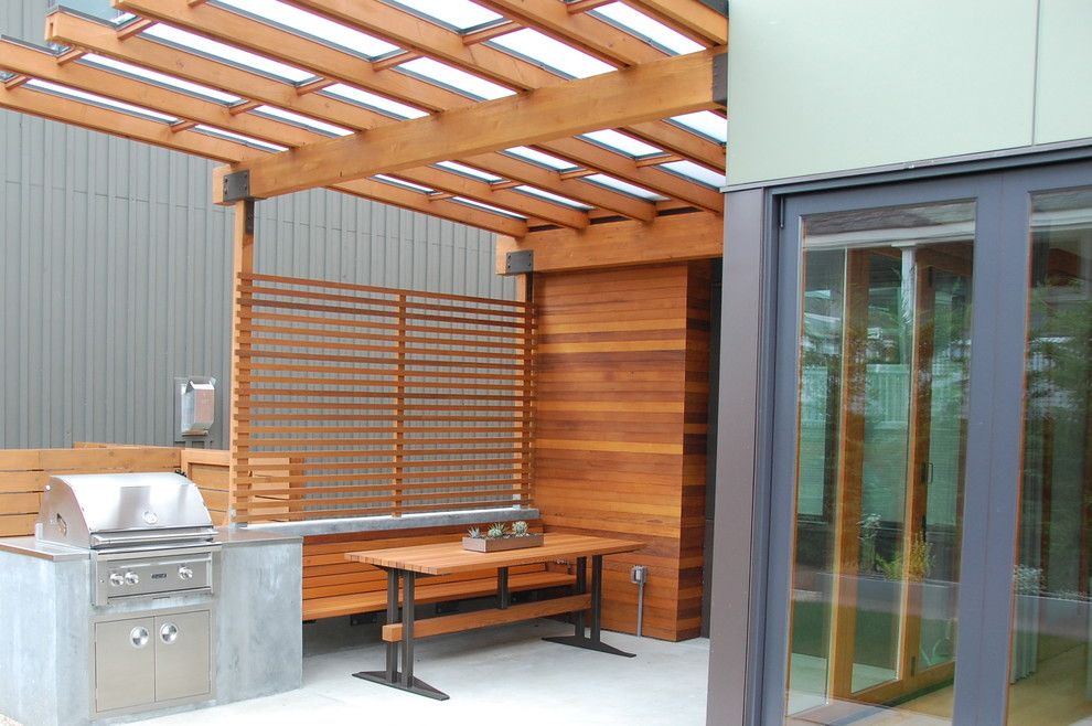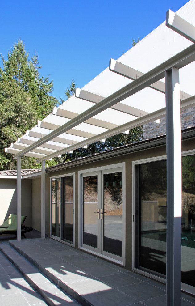 Навес из поликарбоната, пристроенный к дому, в современном стиле
