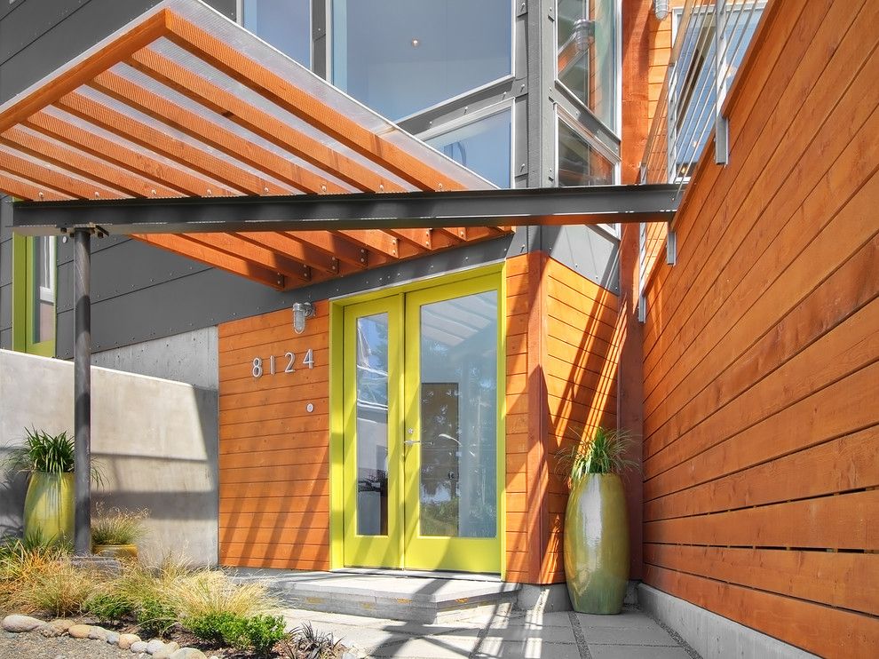 Без козырька над крыльцом стена дачи или загородного дома выглядит пустовато и даже немного уныло. Красиво оформленный вход сразу же создает ощущение уюта. К тому же, стоять у двери в поисках ключей (а в женской сумочке их найти бывает очень сложно), когда на голову сыплется снег или льется дождь, – мягко говоря, не очень приятно. Отличным решением становится навес к дому из поликарбоната, выполняющий несколько функций: