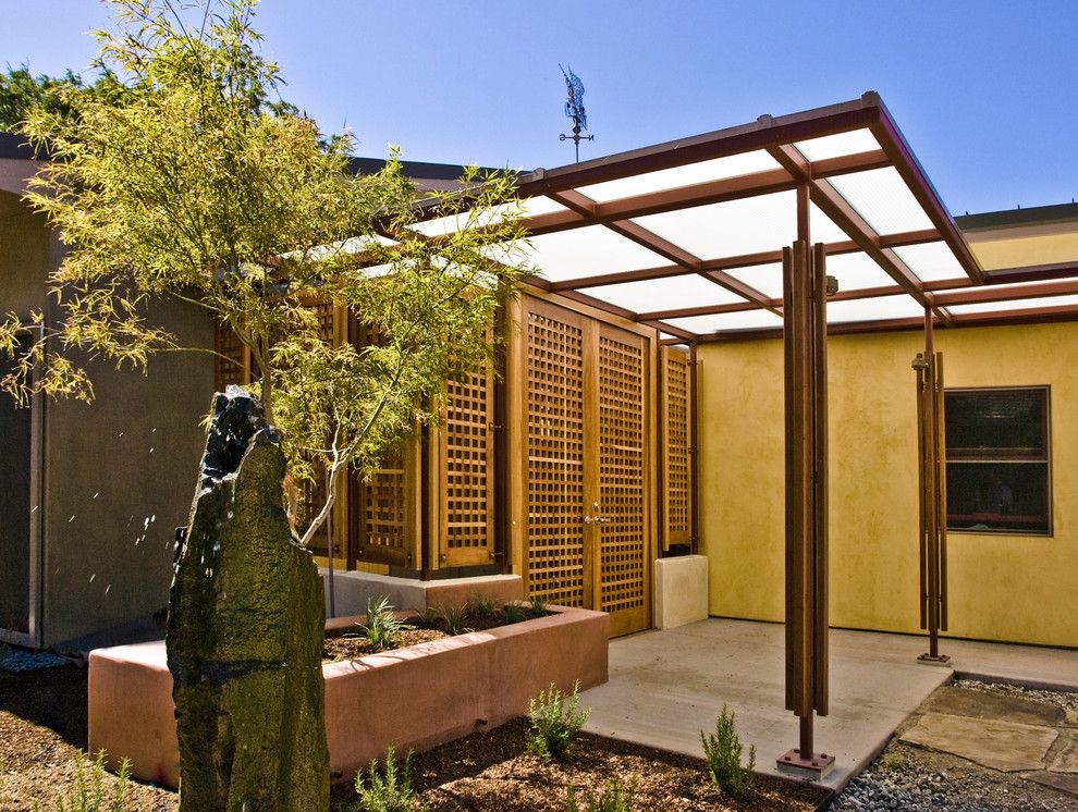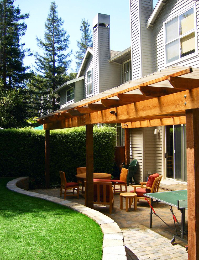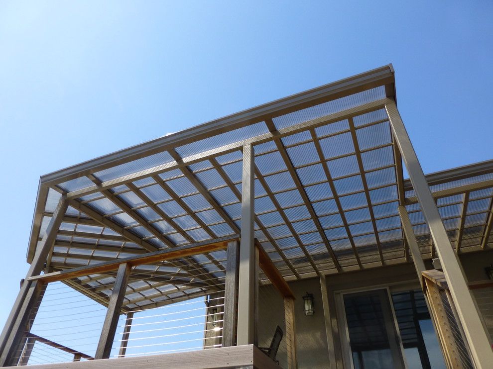 Навес из поликарбоната, пристроенный к дому, защитит вас от солнечных лучей