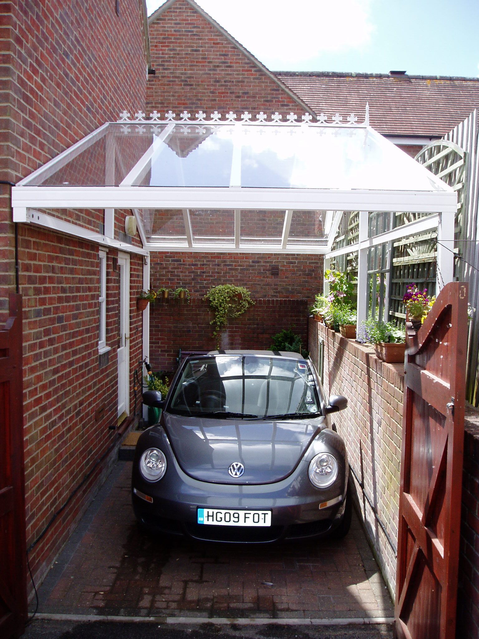 Навес из поликарбоната, пристроенный к дому, защитит вас от сюрпризов непогоды во время открытия замка