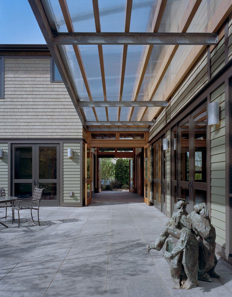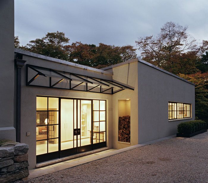 Навес из поликарбоната над крыльцом должен соответствовать общему стилю здания