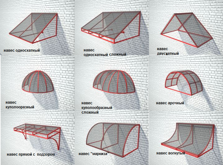 То, как будет смотреться козырек из поликарбоната, зависит от типа его конструкции. Рассмотрим наиболее популярные варианты.