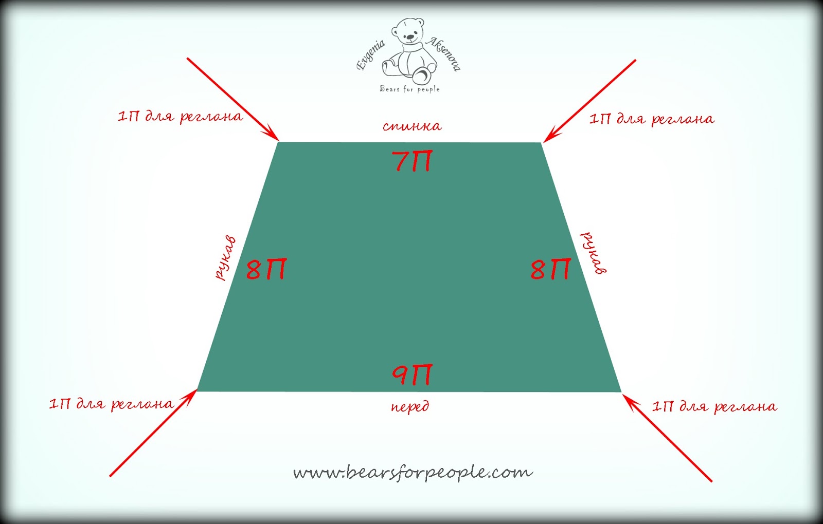 8П (рукав)+1П (реглан)+7П(спинка)+1П(реглан)+8П(рукав)+1П(реглан)+9П(перед)+1П(реглан) = 36П
