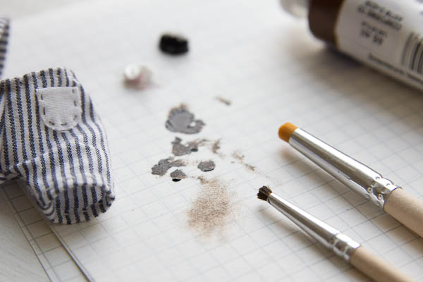 Обычно я всех мишек чуть-чуть состариваю, придаю им вид любимой и потисканной игрушки, поэтому одежду тоже необходимо немного затонировать. Я использую масляную краску, в основном цвета- умбра жженая, умбра натуральная, ван дик, кисти синтетика обрезанные по длине. Выдавливаем небольшое количество краски на лист бумаги, если нужно смешиваем цвета. Набираем на сухую кисть чуть-чуть краски, растираем ее на бумаге, чтобы снять излишки и проводим вдоль швов, низа, краев карманов и т.д.