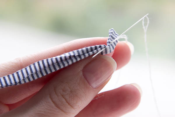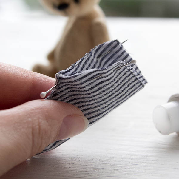 Я обычно делаю приличный запас длины на всякий случай, лишнее всегда можно подрезать, а учитывая миниатюрность детали на расходе ткани это скажется не существенно. В итоге у меня получилась полоска шириной 15 мм и длиной примерно 80 мм. Обрабатываем края средством, предотвращающим осыпание ткани и складываем пополам правой стороной наружу - проглаживаем для фиксации. Теперь нужно сшить две стороны вместе заправляя края внутрь.
