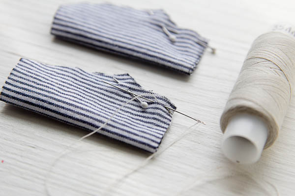 Следующий этап- сшивание деталей. Я делаю отступ где-то 3-4 мм., прошиваю швом «назад иголка». Можно шить на машинке, если вы хорошо ей владеете, мне проще прошить на руках. Каждую делать складываем пополам и прошиваем внутренний шов штанины. Потом одну из деталей выворачиваем на правую сторону и вставляем внутрь второй штанины, выравниваем, фиксируем иголками и прошиваем шов, соединяющий обе штанины.