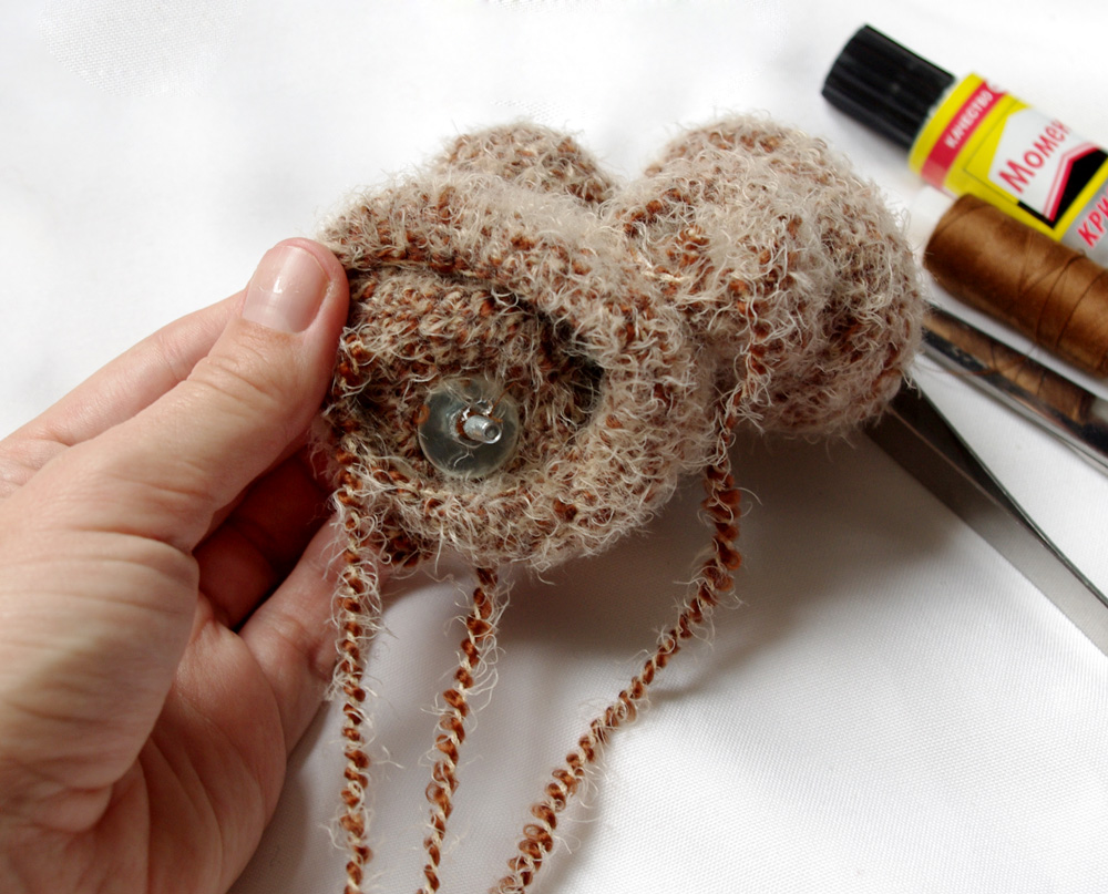 вставляем крепеж и закрываем вязание (провязаывем по 2 стбн вместе. оставшиеся 6 петель стягиваем на нить)