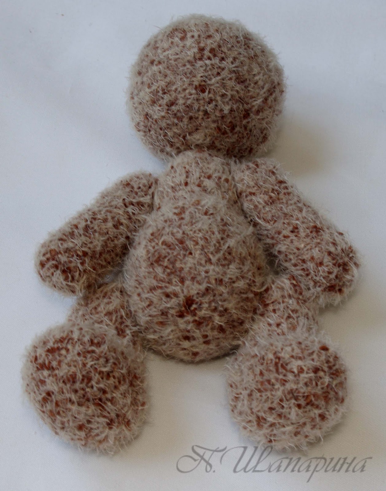 аналогично ножкам, крепим ручки.... набиваем и закрываем как и ножки. Довязаваем 4 ряда для шеи