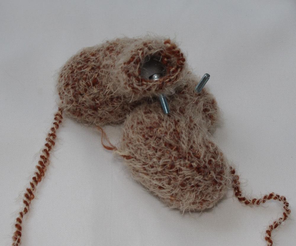 Соединение у нас болтовое. И чтобы оно не рескрутилось, наматываем нитку на болт вплотную к шайбе и ромазываем клеем. Набиваем ножки до конца и закрываем, провязывая по 2 стбн вместе пока вязание не закроется.