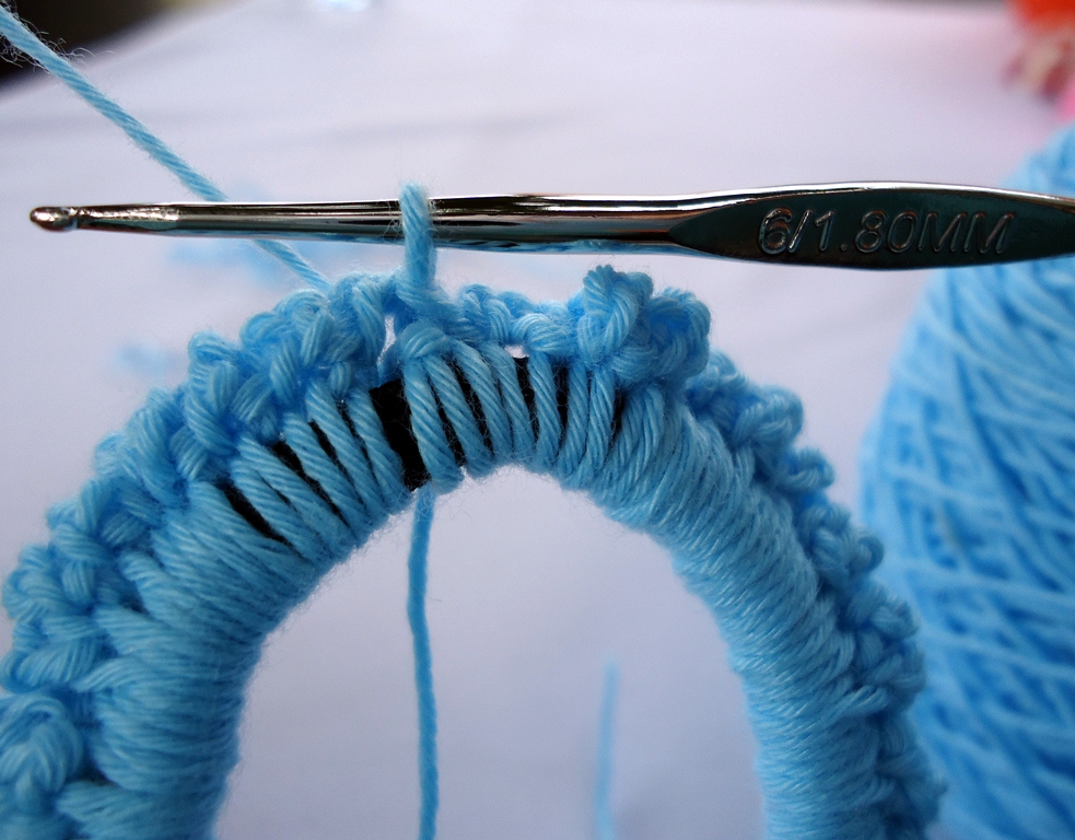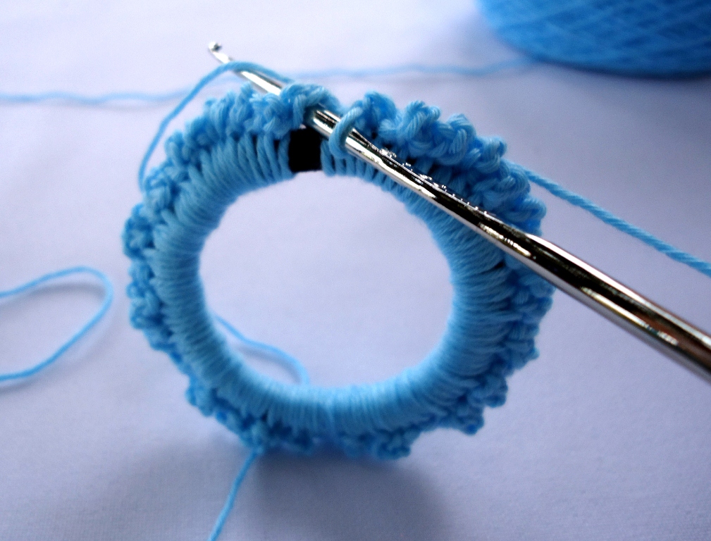 Обвязываем крючком резинку. Далее: После каждой петли обвязанной вокруг резинки - сделать цепочку из 3 воздушных петель