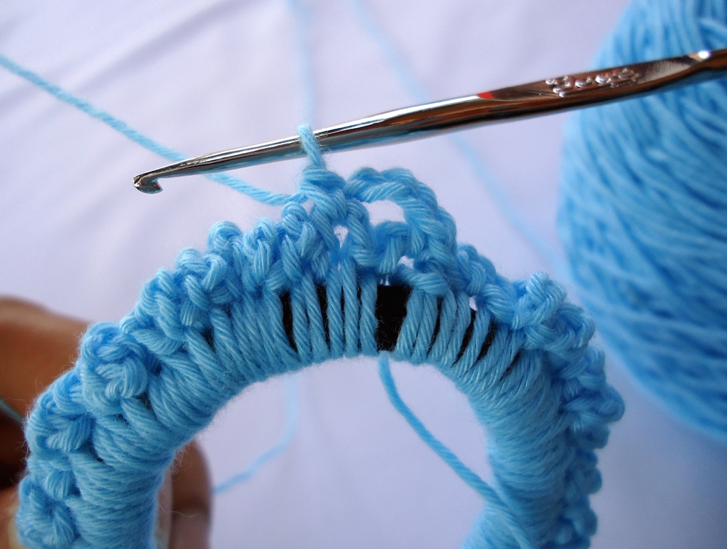 Раунд 3: над каждой цепочкоц из в.п. провязать по 3 в.п. и 5 столбиков с двумя накидами, далее цепочка из 3 в.п. Повторять до конца ряда.