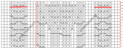 В схеме указаны и лицевые и изнаночные ряды. .Раппорт узора 29 петель в ширину и 16 рядов в высоту.
