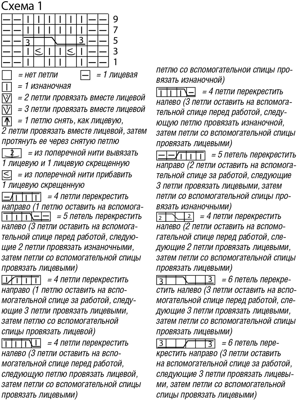 Вязать согл. схеме 1. На ней даны лицевые ряды. В изнаночных рядах петли провязывать по рисунку. Выполнить 1 раз 1—10-й ряды, затем постоянно повторять 5—10-й ряды. После 3-го ряда на спицах будет находиться 10 п.