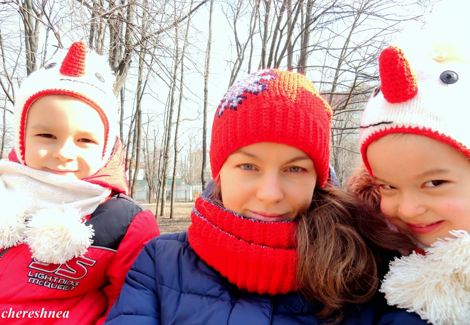 Комплект этот задумывался ещё в прошлом году. Шапочки в прошлом году связала спицами лицевой гладью. И, почему-то, они мне не очень понравились и я их отложила, решив связать к следующей зиме что-то другое. У меня такое часто бывает - когда работаю над чем-то долго, мне начинает казаться что это плохо получается. А вязались шапочки долго т. к. первый раз вязала шапки с ушками спицами.