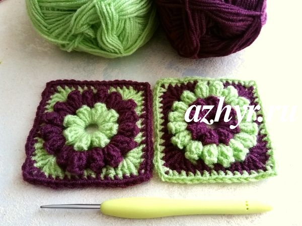 Я навязала образец из остатков акриловой пряжи крючком № 2,5 (лучше было бы брать крючок № 3). Квадраты получились размеров 10 х 10 см.
