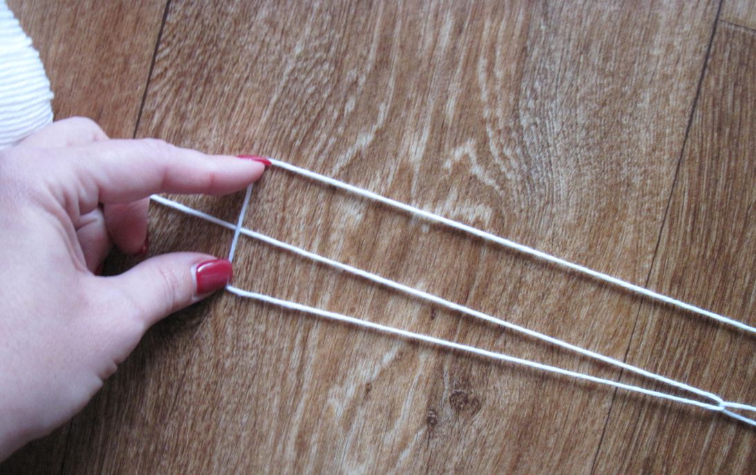 3.Опять берём среднюю нить и вытягиваем петлю и присоединяем к основной нити....