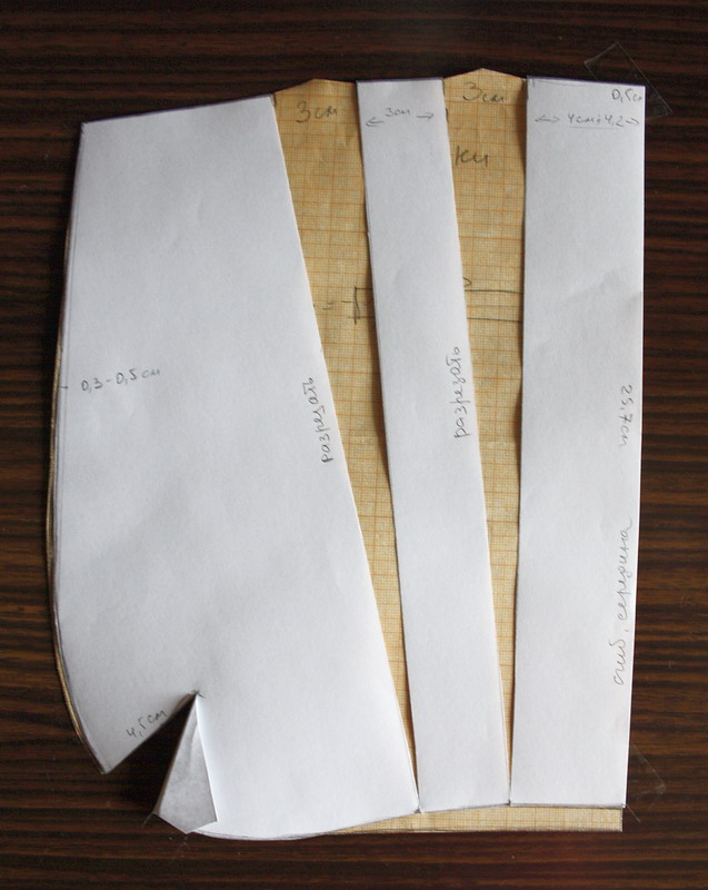 По этим линиям разрезаем сверху выкройку, не доходя внизу 1 мм, чтобы полосы можно было развести в стороны, но они при этом не отрывались: