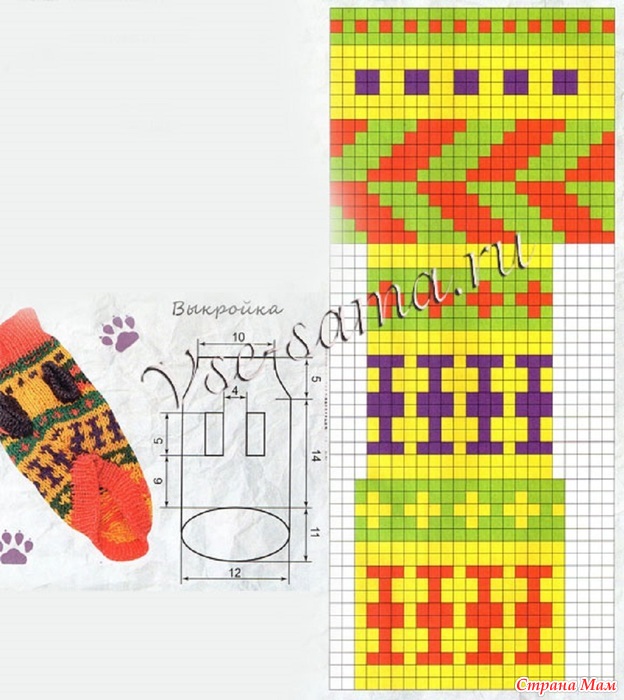 Материалы: остатки 1 разноцветной пряжи желтого, оранжевого, зеленого и : фиолетового цветов, прямые и круговые спицы №3; носочные спицы №2.