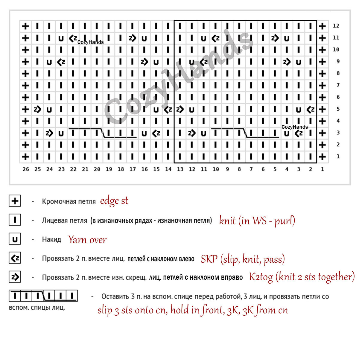 📕 Раппорт узора состоит из 12 петель и 10 рядов.