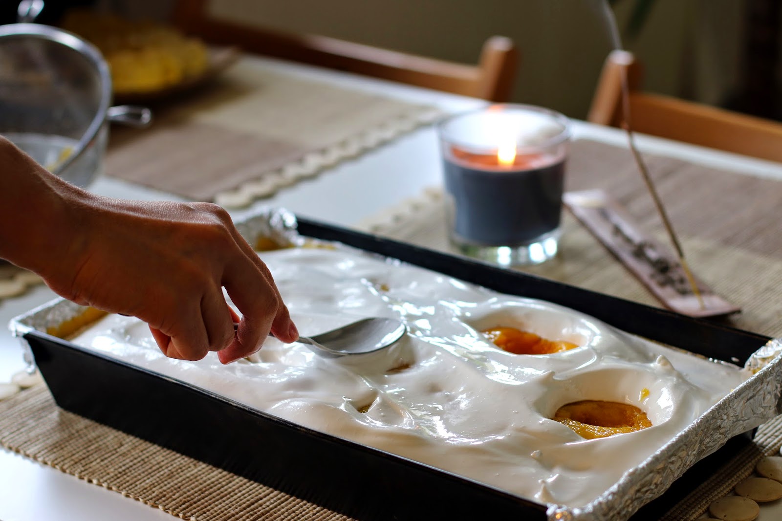 И еще один слой персиков раскладываем на белок, таким же образом.