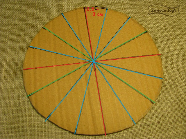 И последнее, что я советую сделать, если вы собираетесь плести корзинку с картонным дном – шаблон этого самого дна. Определяемся с диаметром, рисуем циркулем круг на картоне и вырезаем.