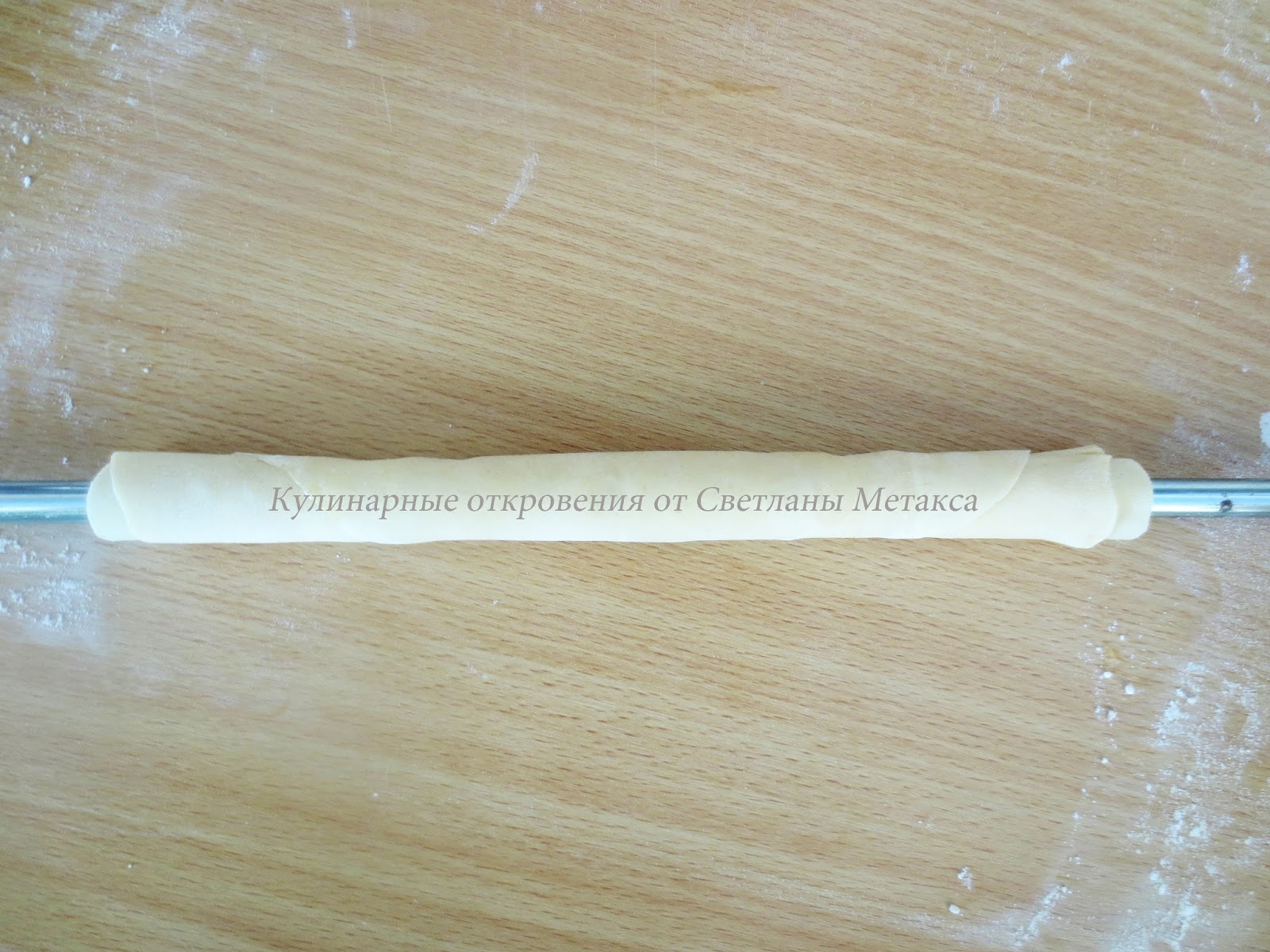 10. С помощью палочки, свернуть тесто в рулет,чтобы не просыпанное начинкой тесто оказалось сверху.
