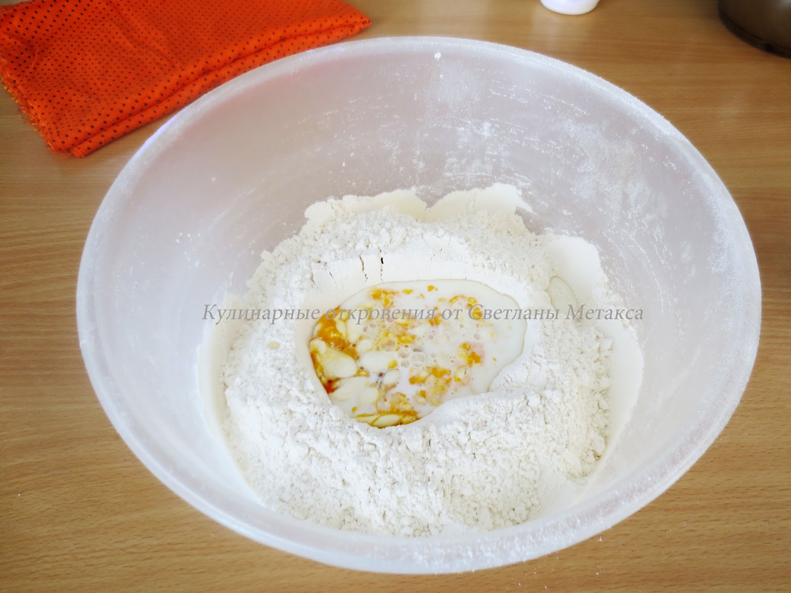 4.Замесить тесто в течении 10 минут. Оно не должно липнуть к рукам. Тесто накрыть и оставить на 30 минут для отдыха.