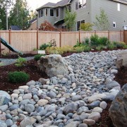 Еще одна достаточно важная положительная функция сухого ручья заключается в том, что при помощи насыпи камней, имитирующих поток воды легко можно замаскировать некоторые коммуникации. И при этом сделать их легкодоступными.