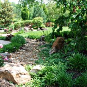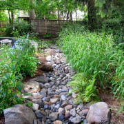 Сухой ручей помимо своего декоративного назначения вполне может быть функциональным, а именно служить дренажем для отвода излишков дождевой воды в садах. И ели оформить такую оригинальную ливневую канаву вдоль дорожек и тропинок, то можно быть уверенным в том, что даже во время сильного ливня на них не будут образовываться лужи.