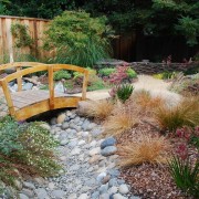 В восточной философии сухой ручей, который начинается с небольшого истока и, извиваясь по всему участку, расширяется как воронка, способствует привлечению в жилище позитивной энергетика, благополучия и гармонии. Мелкие гладкие камешки, такие как галька или дробленая крошка в такой композиции имитируют воду, а вот большие белые валуны играют роль порогов и небольших водопадов. Оригинально смотрятся и дополнительные декоративные элементы, как мостики через каменный поток или деревья и кустарники, нависающие над ручьем.