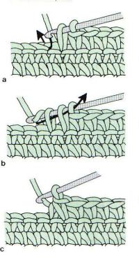 1 петля подъема и затем ввожу крючок в петлю под стрелкой (она между ребер - в "впадине") - провязываю в ней 1 СБН