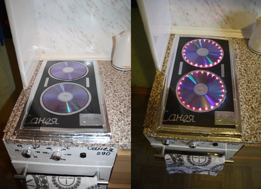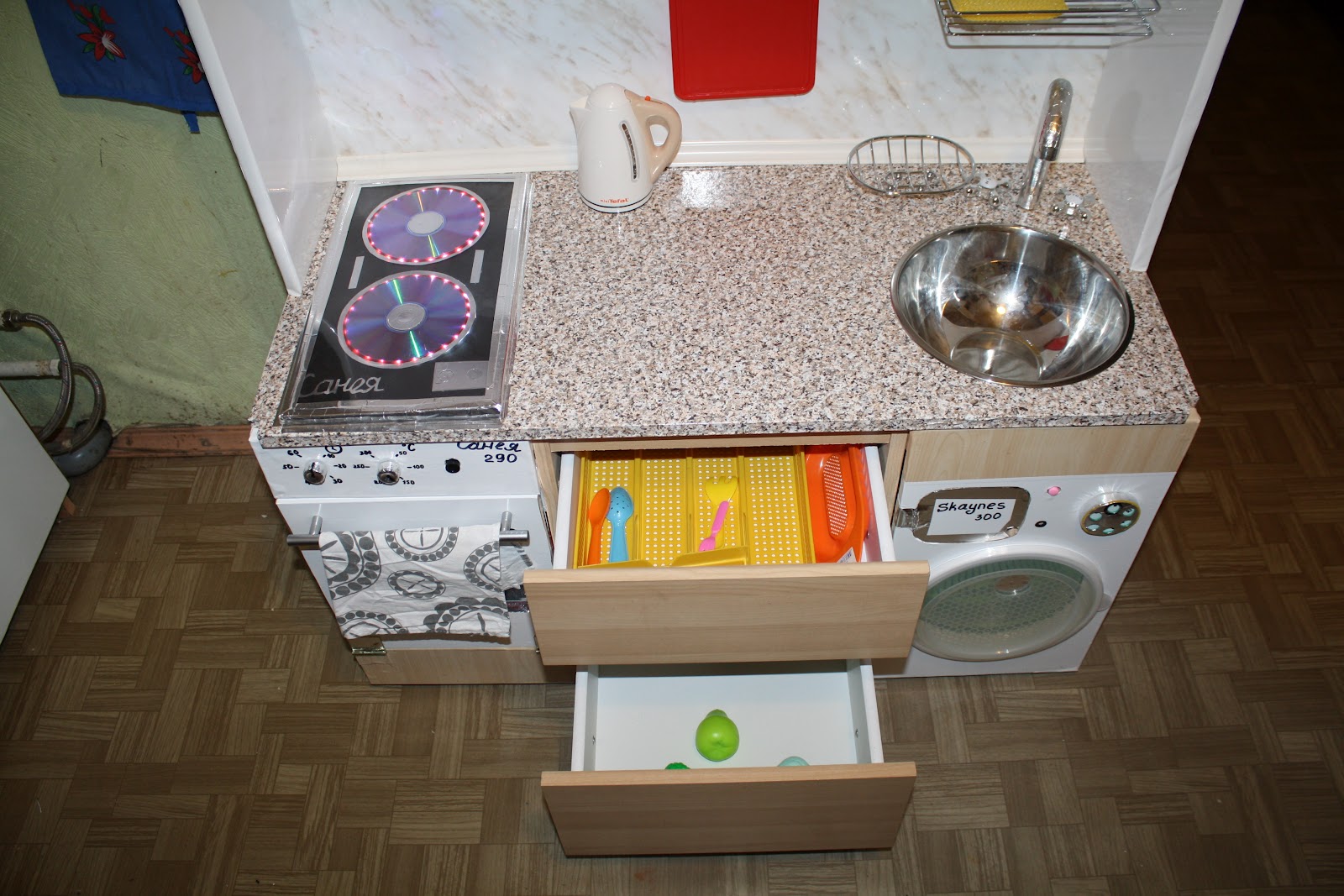 Под столешницей приделали фанерку, на которой разместили блок с батарейками. В этой фанерке просверлили отверстие, в которое вставили лампочку-свет в духовке. Там же разместили и блок с батарейками для духовки.