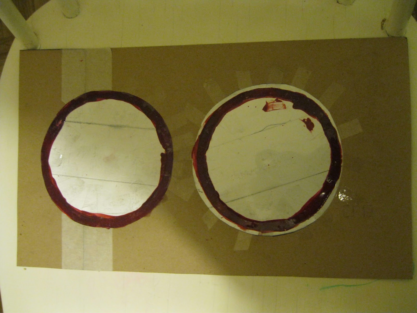Взяла лист черного картона такого же размера как основной, вырезала круги по размеру светодиоидных колец, с обратной стороны приклеила на прорези пленку плотную (от коробки от куклы) и покрасила по краю красным лаком для ногтей.
